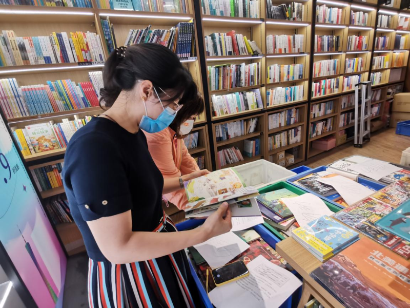 黃埔區(qū)版權(quán)局局長(zhǎng)蘇少貞檢查新華書(shū)店銷售的教輔材料