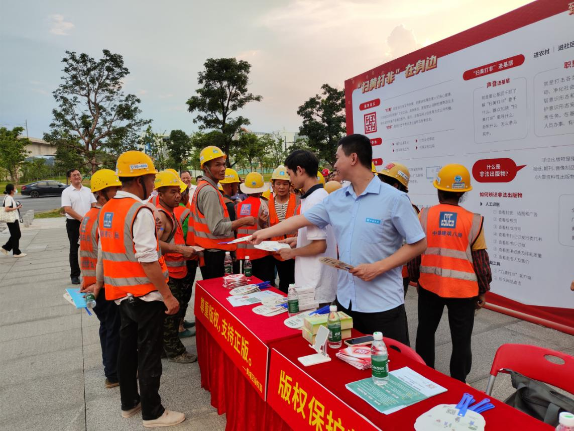 6月9日晚上,由中共廣州市委宣傳部、中共黃埔區(qū)委宣傳部主辦,廣州市住房和城鄉(xiāng)建設(shè)局、黃埔區(qū)住房和城鄉(xiāng)建設(shè)局、中國建筑第八工程局有限公司華南分公司共同協(xié)辦的“致敬廣州高質(zhì)量發(fā)展建設(shè)者”版權(quán)宣傳、“掃黃打非”、公益電影進(jìn)工地活動(dòng)啟動(dòng)儀式在廣州市黃埔區(qū)中新廣州知識(shí)城產(chǎn)業(yè)聚集服務(wù)中心項(xiàng)目正門廣場(chǎng)舉行。黃埔區(qū)版權(quán)局現(xiàn)場(chǎng)組織工友集中觀看了《尋找黃埔版權(quán)IP》公益宣傳片,并進(jìn)行了版權(quán)保護(hù)知識(shí)有獎(jiǎng)問答,吸引眾多工友參與互動(dòng)。