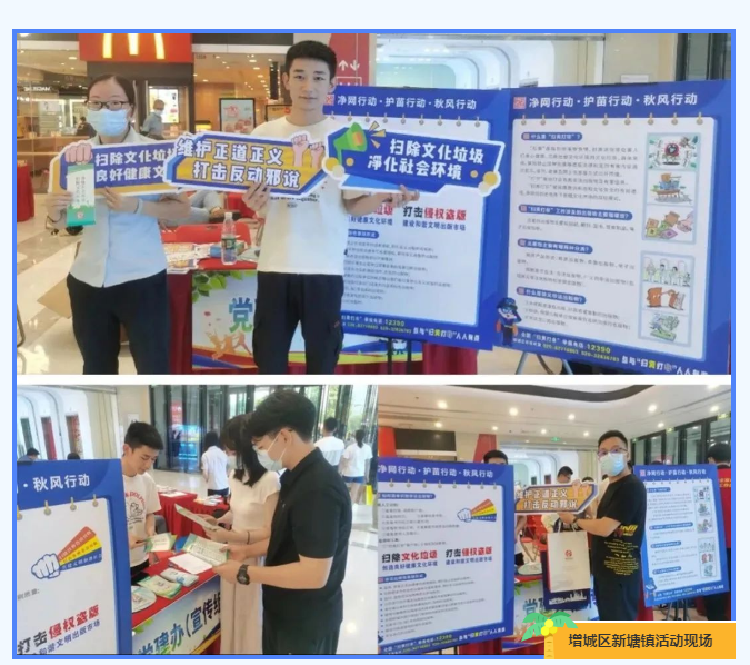 增城區(qū)新塘鎮(zhèn)在新塘萬(wàn)達(dá)廣場(chǎng)開(kāi)設(shè)“掃黃打非”宣講咨詢服務(wù),采取擺放宣傳展板、派發(fā)宣傳手冊(cè)等方式,吸引200余名群眾參與活動(dòng)中,倡導(dǎo)自覺(jué)抵制有害出版物、色情網(wǎng)絡(luò)的侵蝕。許多家長(zhǎng)表示會(huì)更加關(guān)注讀物對(duì)孩子健康成長(zhǎng)的影響,爭(zhēng)當(dāng)支持正版、拒絕有害出版物及不良信息的監(jiān)督人?;ǘ紖^(qū)花東鎮(zhèn)聯(lián)合禁毒辦、綜治辦、社工站等相關(guān)部門(mén)在大塘初級(jí)中心開(kāi)展國(guó)際禁毒日暨“掃黃打非”宣傳活動(dòng),約400名師生參加此次活動(dòng)。通過(guò)現(xiàn)場(chǎng)講解、發(fā)放宣傳品等方式與學(xué)生互動(dòng),增強(qiáng)廣大學(xué)生自覺(jué)抵制非法出版物意識(shí)。