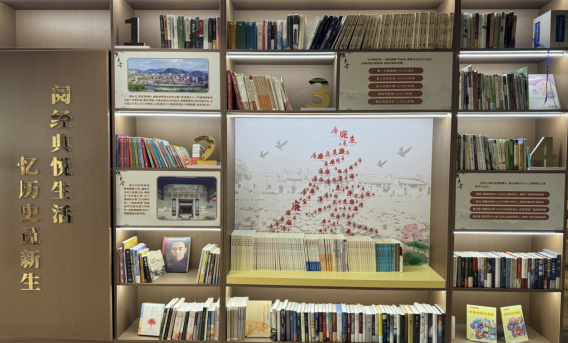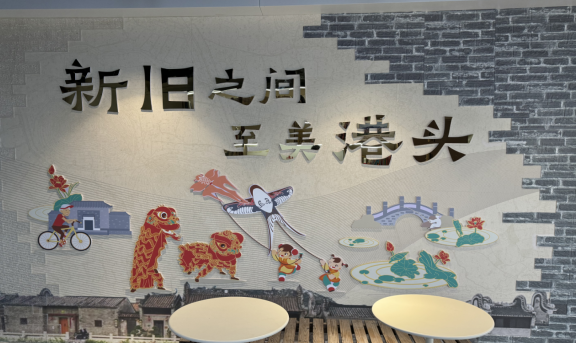 文化展示區(qū)錯落有致的書架封板上,正向八方游客訴說著港頭村“耕讀傳家”的文化內(nèi)核以及“五代連登科”的文化自信。文化墻一側(cè),以“新舊八景”為題,描繪了一幅古今結(jié)合、充滿朝氣的美好畫卷,回應了港頭村農(nóng)家書屋“以書為媒,連接新舊”的時代使命。